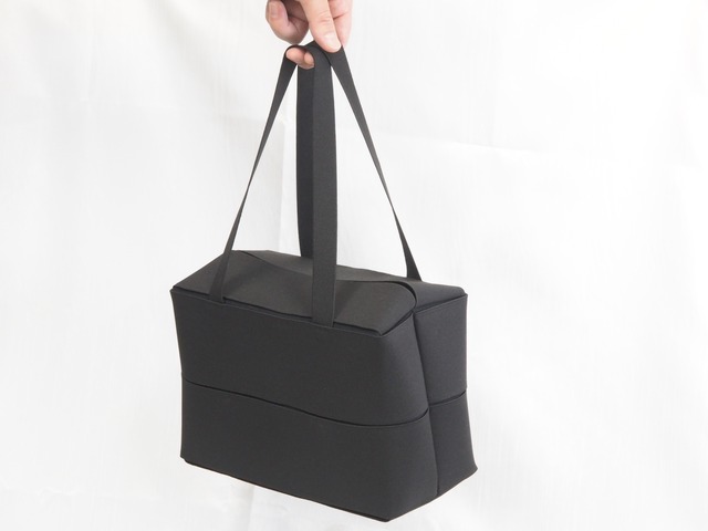 金沢美術工芸大学の学生さんと、株式会社良品計画生活雑貨部企画デザイン課さまの協力のもと、弊社と連携し開発した商品が「無印良品 野々市明倫通り」で開催されるイベント「つながるモノづくり市」で販売される商品を先行販売いたします。 事の発端は、連携先を探していた金沢美術工芸大学の学生さんがたまたま弊社のHPを見て「 平ゴム 」に興味をもってくれたことでした。我々はその偶然の出会いに感激しました! 開発したい商品のコンセプトは、「 Enjoy! 」ビョンビョン伸びる持ち手、振り回せるカバンだったかと思います。突拍子もない発想で、カバンとしての常識を逸脱しているのが面白いと思い、一緒に作ることにしました。 試行錯誤の上、ようやく完成した商品が、おでかけが楽しくなる「 全てゴムでできたおでかけバック 」です。 しなやかな素材感と軽さが魅力で、どんなスタイルにも合わせやすい一品。 持つたびに何かが始まるようなワクワク感が生まれ、日常の何気ないひと時に特別な感覚をもたらしてくれるでしょう。 あなたの旅やお出かけをより楽しく、素敵なものに変える存在になること間違いなしです! カラー:①ベージュ(持ち手ベージュ)②ベージュ(持ち手黒)③黒 サイズ:約16cm×25cm×12cm×50cm(高さ×幅×マチ×持ち手) 素 材:ポリエステル、ポリウレタン(ゴム) 重 量:①、②約170g ③約180g